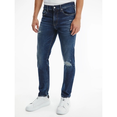 Pánské modré džíny od Calvin Klein. Džíny mají značkové kování a kožený odznak na zadní straně. Džíny jsou lehce trhané a mají zapínání na zip. Džíny jsou širší přes stehna...