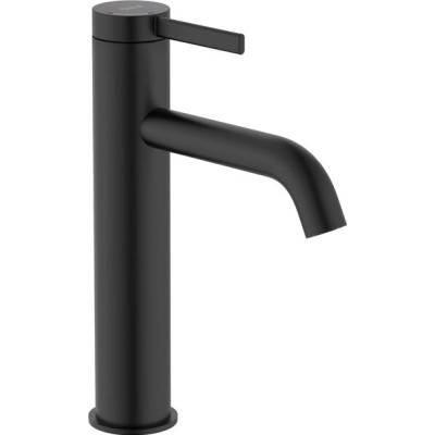 Páková stojánková umyvadlová baterie s clic-clacem v černé barvě. Průtok baterie je 5 litrů/minutu. Výška baterie je 32 cm. Ramínko je ve výšce 23,4 cm. S matným povrchem.
