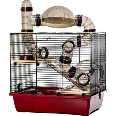 Klece a ohrádky ROCKY+TARAS, bordó, klec pro hlodavce: klec určena hlavně pro křečky, černá klec, béžová barva příslušenství, obsahuje kolotoč, domeček, terasa, miska a...