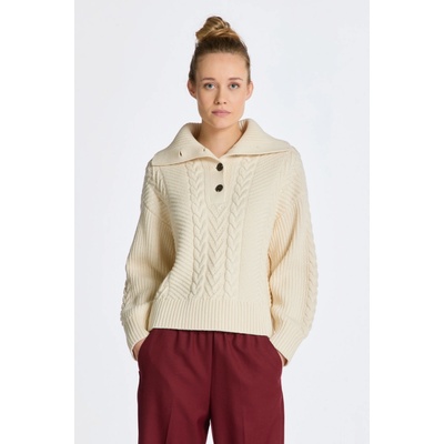 Dámský svetr se strukturovaným pleteným vzorem. Uvolněný design se spadlými rameny a rolákem opatřeným zapínáním na knoflíky doplňuje žebrovaný lem v pase a na rukávech....