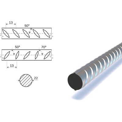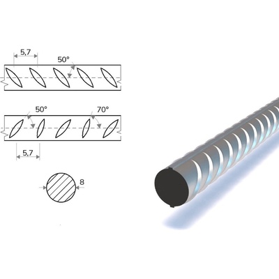 Tvářené tyče kruhového průřezu s žebírky na povrchu pro výztuž do betonu -armovnání ve výrobních délkách 6,0 m. Materiál odpovídá normě DIN 488.Vyrábí se za studena nebo za tepla a dle výrobního postupu majítyto typy různé mechanické vlastnosti. Alternativně je užíváni...