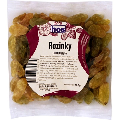 HOS Rozinky Jumbo zlaté 200g Rozinky zlaté JUMBO jsou velké, šťavnaté a krásně zlaté sušené plody vinné révy. Díky sladkým hroznům z teplých oblastí mají intenzivní chuť a...