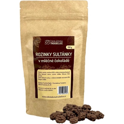 Šťavnaté rozinky v natural kvalitě obalené v lahodné mléčné čokoládě té nejvyšší kvality. Složení: rozinky 50%, mléčná čokoláda (kakaové boby, kakaové máslo, sušené mléko,...