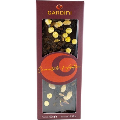 Tato prémiová čokoláda značky Gardini je vyrobena z čokolády s množství kakaa 62 % — jemné, vyvážené hořkosti — doplněná o pečené lískové oříšky a jemně sladké rozinky....