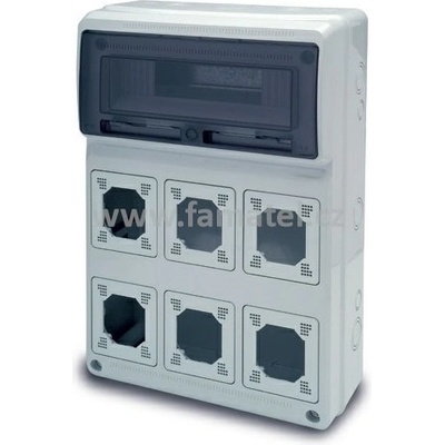 Skříň 3962 AcquaCOMBI IP65, 16 mod., 6 otvorů, 506x330x130/155mm, vybaveno svorkovnicí PE/N (2x SPTC-4: celkem 8x16mm2 + 16x10mm2), spojovatelná. Systém DoubleTWIST.