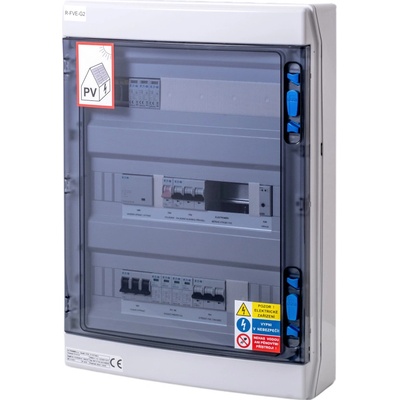 Nástěnný rozvaděč pro 2 FV stringy s průhledným víkem pro fotovoltaické systémy do 1000 V. Rozvaděč je vybaven 2 svodiči přepětí T12 PV 1100/6,25 Y typu T1+T2, 2 pojistkovými...