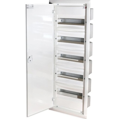 Modulární rozváděč pod omítku s kapacitou 60 modulů (5 řad po 12) pro zajištění bezpečného a estetického rozvodu elektrické instalace. Je vybaven bílými kovovými dvířky a...