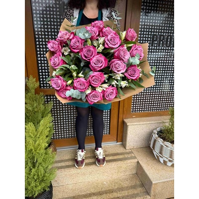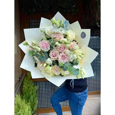 Kytice čerstvých prémiových eustomy a prémiových bílých růží s eukalyptem. Velká kytice: 31 růží, průměr 45-50 cm (na fotce). Střední kytice: 15 růží, průměr cca 25 cm. Ke každé...