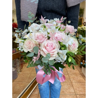 Kytice čerstvých prémiových eustomy a prémiových bílých růží s eukalyptem. Velká kytice: 31 růží, průměr 45-50 cm (na fotce). Střední kytice: 15 růží, průměr cca 25 cm. Ke...