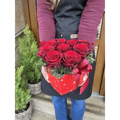 Flower box - naše růže v srdcové krabici, plný čerstvých květů 11 prémiových růží. Průměr 20cm, výška 20cm, zlatá mašle. Růže jsou vždy v plné kvalitě, u kterých může odrůda...