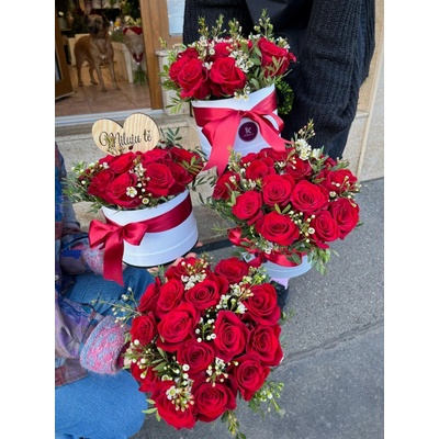 Flower box - naše růže v krabici, plný čerstvých květů 15 prémiových růží. Průměr 25cm, výška 20cm. Do boxu vždy přidáváme doplňkovou zeleň a drobné květinové doplňky pro větší...
