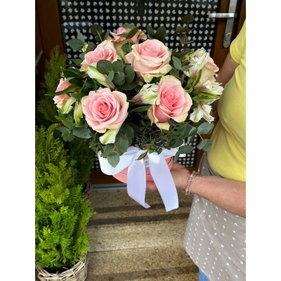 Romantická květinová krabice s 9 prémiovými růžovými růžemi, bílými alstromeriemi, eucalyptem a doplňkovou zelení. Pokud hledáte dárek k narozeninám nebo pro kolegyni, je toto...