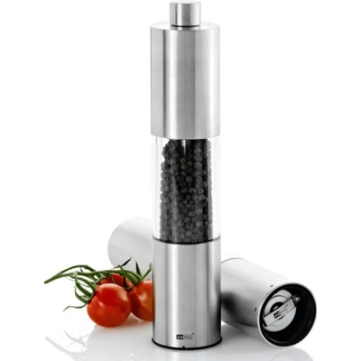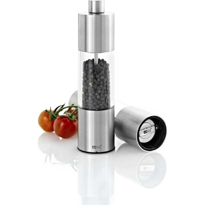 Mlýnek na koření/pepř/sůl je vyroben z nerezavějící oceli a plastu s keramickým mlecím mechanismem s nastavitelnou hrubostí mletí, průhledné doplňovací dvě komory umožňují sledovat naplněnost mlýnku, ovládání mlýnku za pomocí otáčecího mechanismu na obou stranách,...