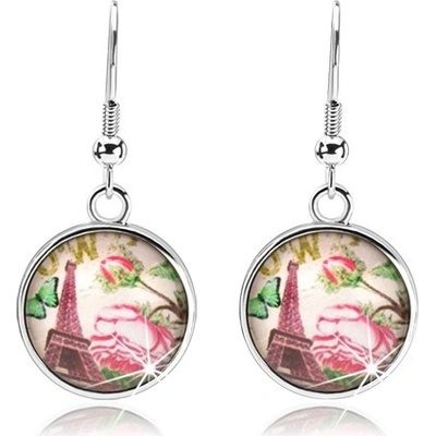 Náušnice ve stylu kabošon, vypouklé průhledné sklo, obrázek - Eiffelova věž, zelený motýl, růže růžovo-bílé barvy.
