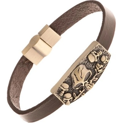 Náramek s magnetickým zapínáním, pás tmavohnědé syntetické kůže, obdélníková známka, velká lebka s růží v zubech.