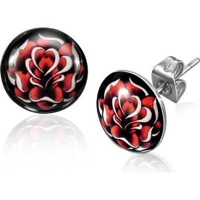 Náušnice z chirurgické oceli stříbrné barvy, hlavička s čirou glazurou, červený květ na černém podkladu.