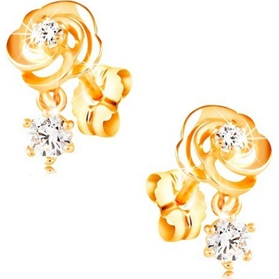 Zlaté náušnice 585, rozkvetlá růžička s jedním čirým zirkonem uprostřed a druhým visícím ve spodní části.