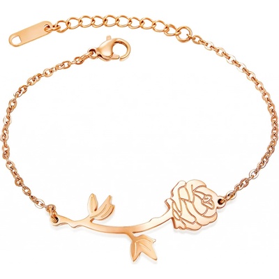 Ocelový náramek měděné barvy je z jemného řetízku z oválných oček a z ozdobné části - jemně gravírované růže, karabinka.