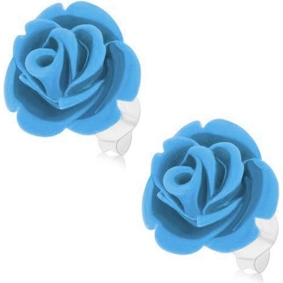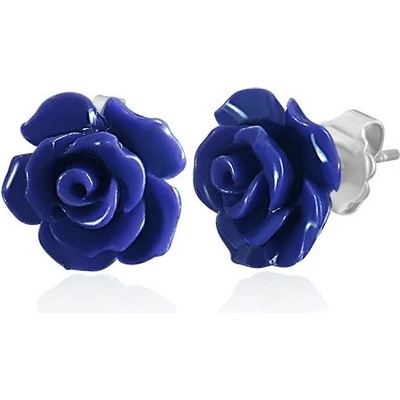Ocelové náušnice s puzetovým zapínáním ve tvaru rozkvetlého květu růže v modré barvě.