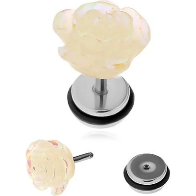 Falešný plug do ucha z akrylu, rozkvetlá růžička v jemném světle žlutém odstínu s odlesky v duhových barvách.