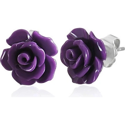 Ocelové náušnice ve tvaru rozkvetlé růže fialové barvy, puzetové zapínání.