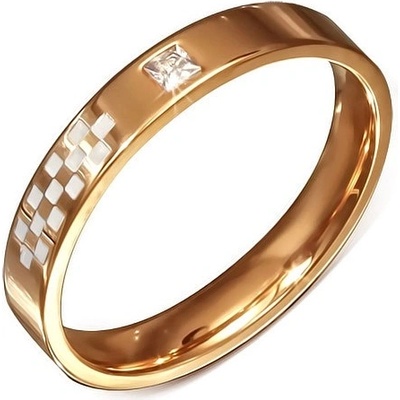Lesklý ocelový prsten barvy růžového zlata, bílý šachovnicový vzor, čtvercový zirkon čiré barvy.