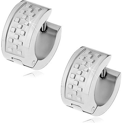 Ocelové náušnice ve stříbrném odstínu, drobné čtverce, lesklo-matné provedení, kloubové zapínání.