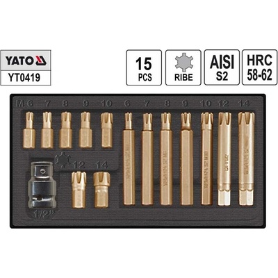 Yato Sada bitů 15 ks RIBE box, YT-0419 Profesionální sada bitů Yato, pro speciální šrouby Ribe. Tato sada je vhodná pro profesionály, především pro mechaniky. Bity jsou spolu s adaptérem uzpůsobeny pro práci s ráčnou 1/2". V sadě se nachází bity Ribe M6, M7, M8, M9,...