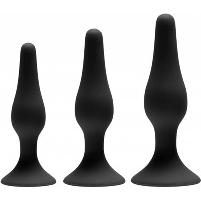 Sada 3 análních kolíků rozličných rozměrů s rovným hladkým tělem z PVC. V černém provedení. Flexibilní s plochou základnou a se špičkou ve tvaru penisu.