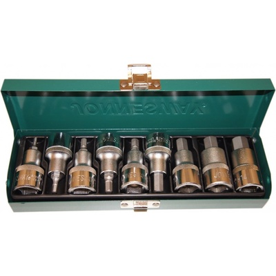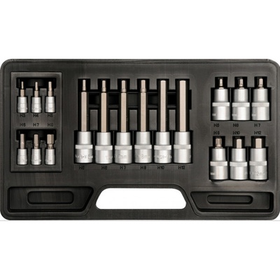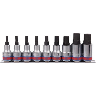 4x 1/4" zástrčné 6hranné hlavice Imbus (HEX): 3-4-5-6 mm 5x 3/8" zástrčné 6hranné hlavice: 7-8-9-10-12 mm Dodávána na kovové liště.