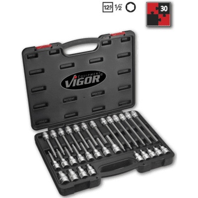Pohon vnitřní čtyřhran 12,5 = 1/2”, 30 dílná, pro šrouby s vnitřním šestihranem.Profesionální sada nástrčných hlavic 1/2" s kovanými hroty. Kvalitní německá značka VIGOR. Pro...