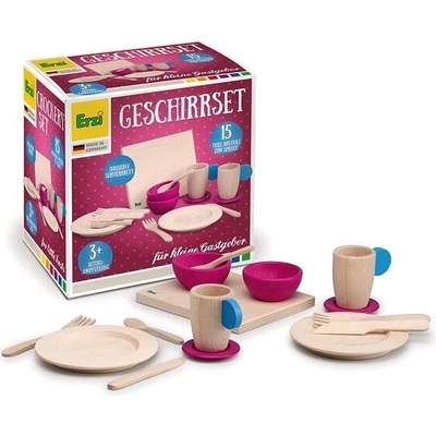 Dřevěná sada na stolování pro plyšáky nebo panenky potěší každou malou kuchařku a kuchaře.Obsah sady: 2x talíř, 2x vidlička, 2x nůž, 2x lžička, 1x hrnek s podšálkem, 2x miska...