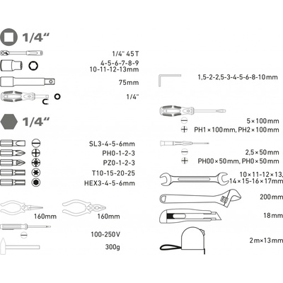Sada nářadí se širokým spektrem použití. Bohatá kombinace nejpoužívanějších kleští, šroubováků a klíčů doplněná o zámečnické kladivo a zkoušečku napětí. Díky svému složení je...
