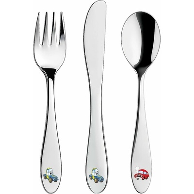 Dětský příbor s barevným dekorem AUTO. Obsahuje 3 ks - lžíci, vidličku a nůž. Materiál: kvalitní nerez. Tvar přizpůsobený dětem. Lze mýt v myčce na nádobí, ale nedoporučujeme, mohlo by dojít k porušen