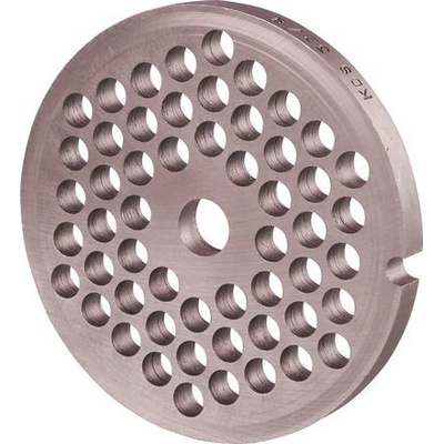 Nerezové sítko 22/8 - masořezka - šajba do ručního mlýnku na maso "22" Průměr: cca. 82mm Fi otvory: 8 mm Průměr otvoru pro čep: cca. 12,5 mm Tloušťka: 85mm (foto je pouze ilustrační - kupované sítko se může lišit počtem otvorů)