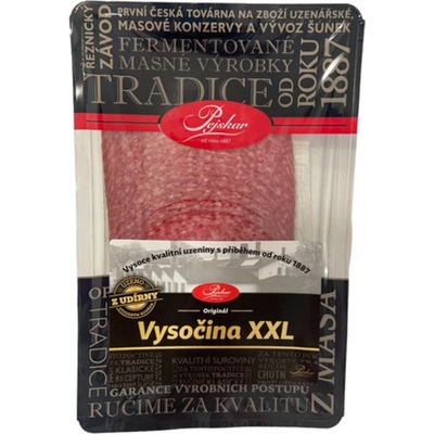 -- Pejskar Vysočina krájená, tradiční salám s jemně kořeněnou chutí a uzenou vůní. Oblíbený, díky praktickému balení. Vhodný na přípravu svačinek a obložených talířů. Vychutnejte si Vysočinu krájenou od českého výrobce Pejskar s poctivou kvalitou a delikátní chutí. O...