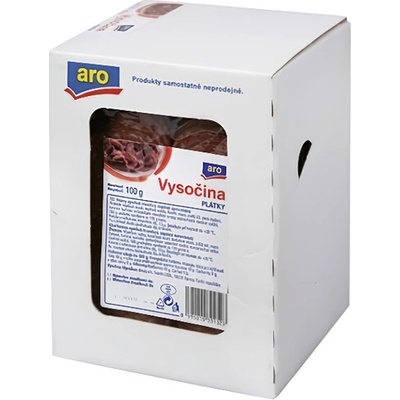 ZÁKONNÝ NÁZEV POTRAVINYVysočina. Masný výrobek trvanlivý tepelně opracovaný. Baleno v ochranné atmosféře.SLOŽENÍvepřové maso, vepřové sádlo, hovězí maso, jedlá sůl, vepřové...