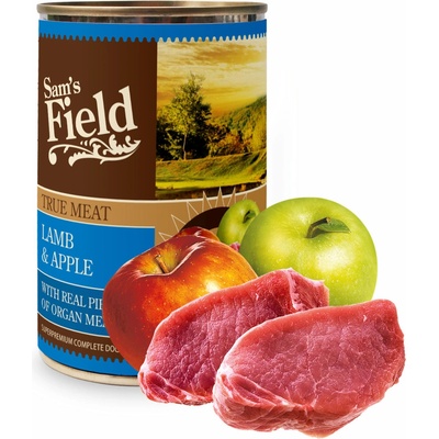 Sam's Field True Lamb Meat & Apple. Superprémiová masová konzerva pro psy s vysokým obsahem 66 % pravého jehněčího masa, s jablky. S kousky masa z vnitřností. Vysoce kvalitní...
