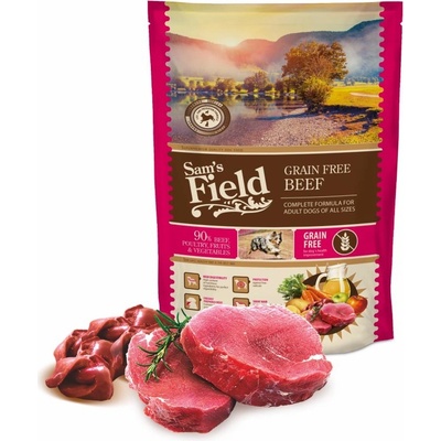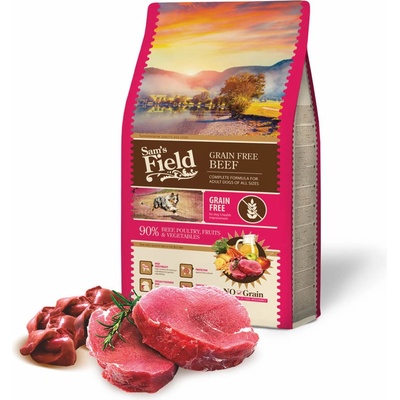 Sam's Field Grain Free Beef (Angus). Superprémiové krmivo s nulovým obsahem obilovin a s vysokým obsahem hovězího masa (Angus) 28 % a kuřecího masa 22 %. Kompletní krmivo...