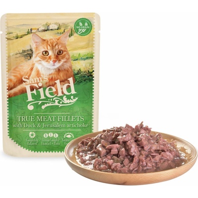 Kachní maso s topinamburem. Kompletní krmivo pro kočky. Sam's Field True Meat Fillets with Duck & Jerusalem Artichoke Topinambur je zdrojem prebiotické vlákniny a vitaminů s...