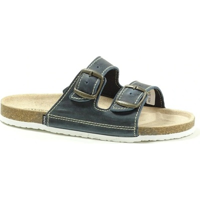 Pánský zdravotní korkový pantofel s otevřenou špičkou modré barvy se světlou podrážkou. Anatomicky tvarovaná stélka a bílá podrážka jsou vhodné na venkovní i vnitřní užití....
