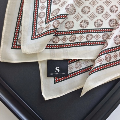 Rozměry hedvábného šátku jsou 53 cm x 53 cm. Šátky jsou vyráběny ručně a tak se rozměr může mírně lišit. Materiál: 100% morušové hedvábí, provedení silk satin, počet vláken...