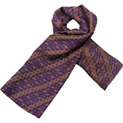 Hedvábný šátek s výrazným fialovým vzorem na matně zlatém podkladu. Lehký šátek z pravého hedvábí je vzorovaný technikou voskové batiky. Přírodní hedvábí je oblíbené především...