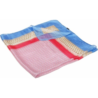 Jemný hedvábný šátek zdobený potiskem s geometrickým vzorem v bílé, růžové, světle modré a zlaté barvě. Lehounký a velmi příjemný na omak.