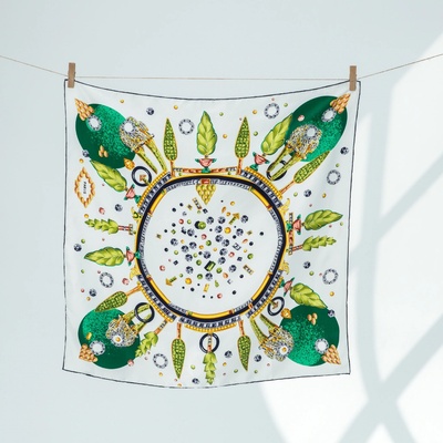 Nechte se vtáhnout do neopakovatelného příběhu z dálných krajin prostřednictvím tohoto luxusního hedvábného šátku, za jehož motivem stojí bahrajnská umělkyně Ghassan Mohsin....