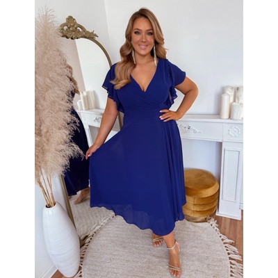 Dlhé spoločenské šaty pre moletky s krátkym rukávom v tmavomodrej farbe majú elastickú gumičku v páse a voľnú sukňu. Modelka meria 168 cm a má na sebe veľkosť XL...