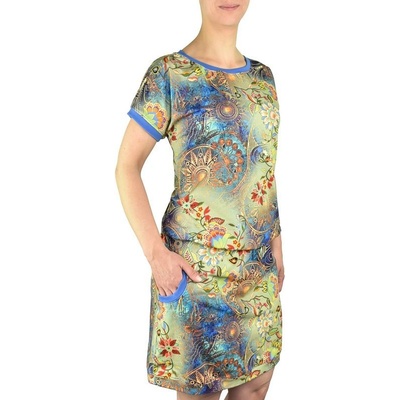 Dámské šaty z příjemného materiálu s kapsami v modrém provedení s mandalami a květy.Autorská tvorba ostravské rodačky. Popis: krátký rukáv, kapsy po bocích, jedinečný...