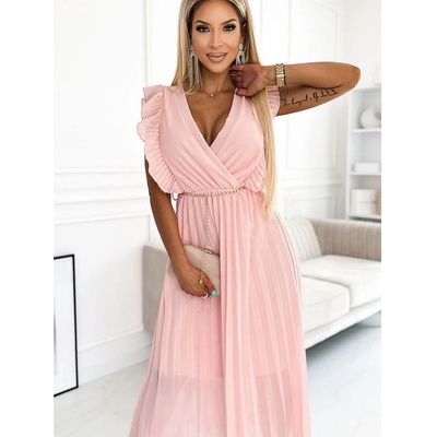 Elegantní dámské šaty 374-5 POLINA Numoco bez rukávů. Dámské šaty mají ramena ozdobená volánky. Šaty mají překřížený výstřih, rozšířenou šifónovou sukni a v pase je pásek....