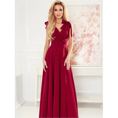 ELENA - dlouhé šaty s výstřihem, rozparkem na nohavici a mašlemi na ramenou. Vyrobeno z materiálu příjemného na dotek v módní vínové barvě. Polský výrobek. Značka Numoco....