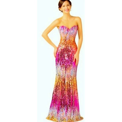Luxusní společenské dlouhé šaty. Vrchní díl s odhalenými rameny, sukně pošitá flitry, oblasti prsou vycpávkové zpevnění pro svůdný dekolt(není třeba nosit podprsenku), vzadu na...